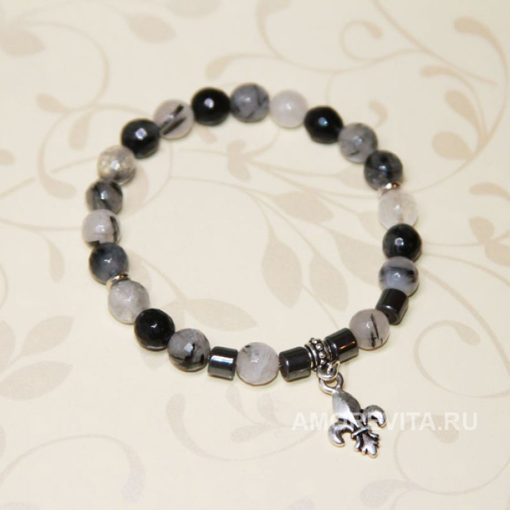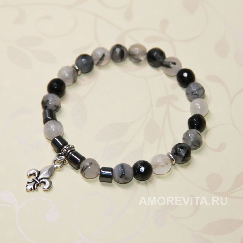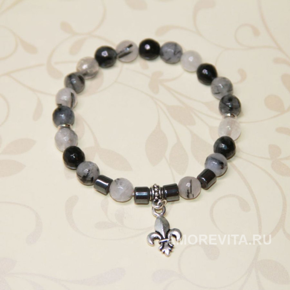 Браслет из Кварца и Гематита в черно-сером цвете с подвеской королевской лилией.