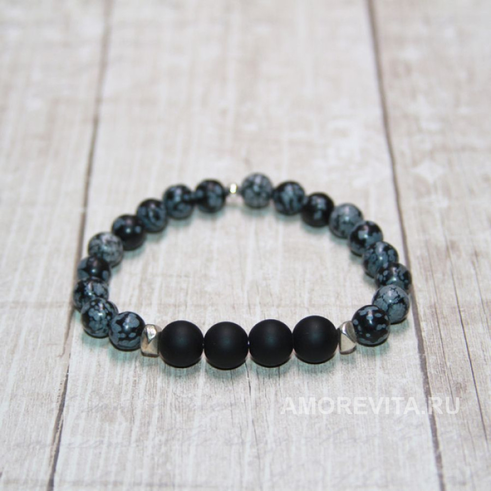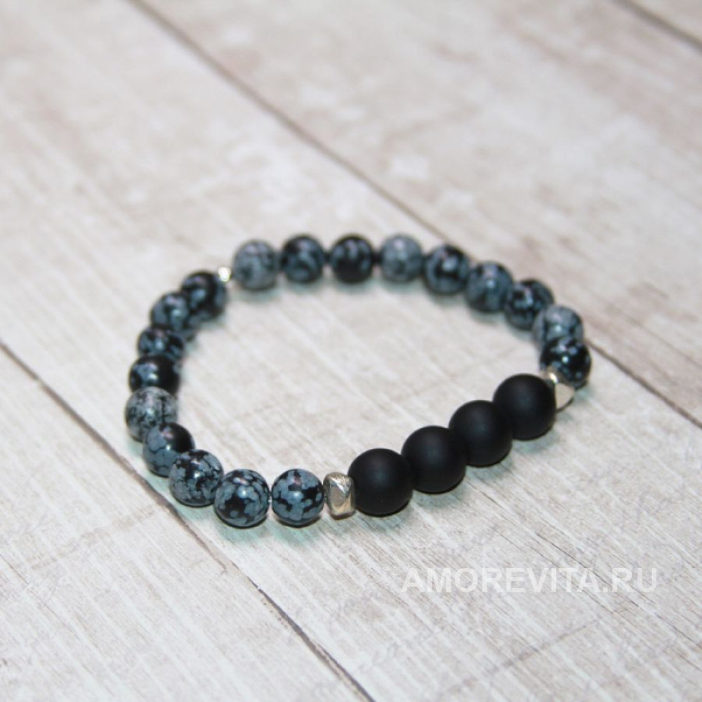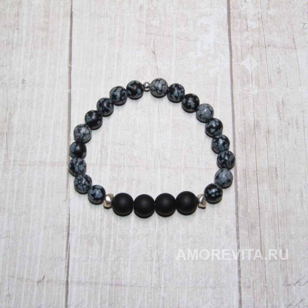 Браслет из Обсидиана серо-черного цвета и черного матового Шунгита.