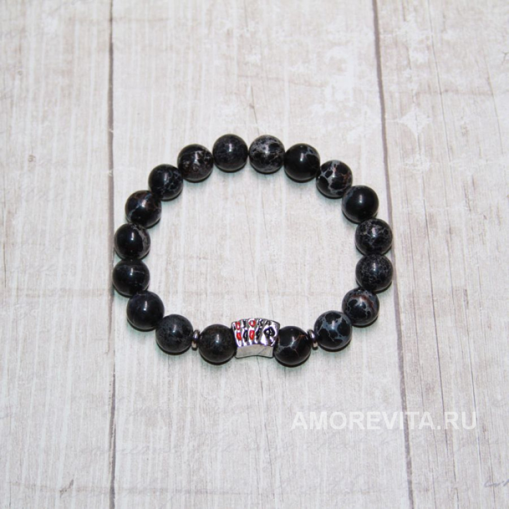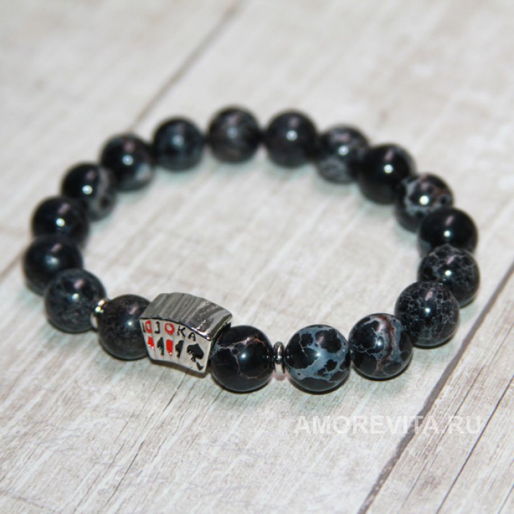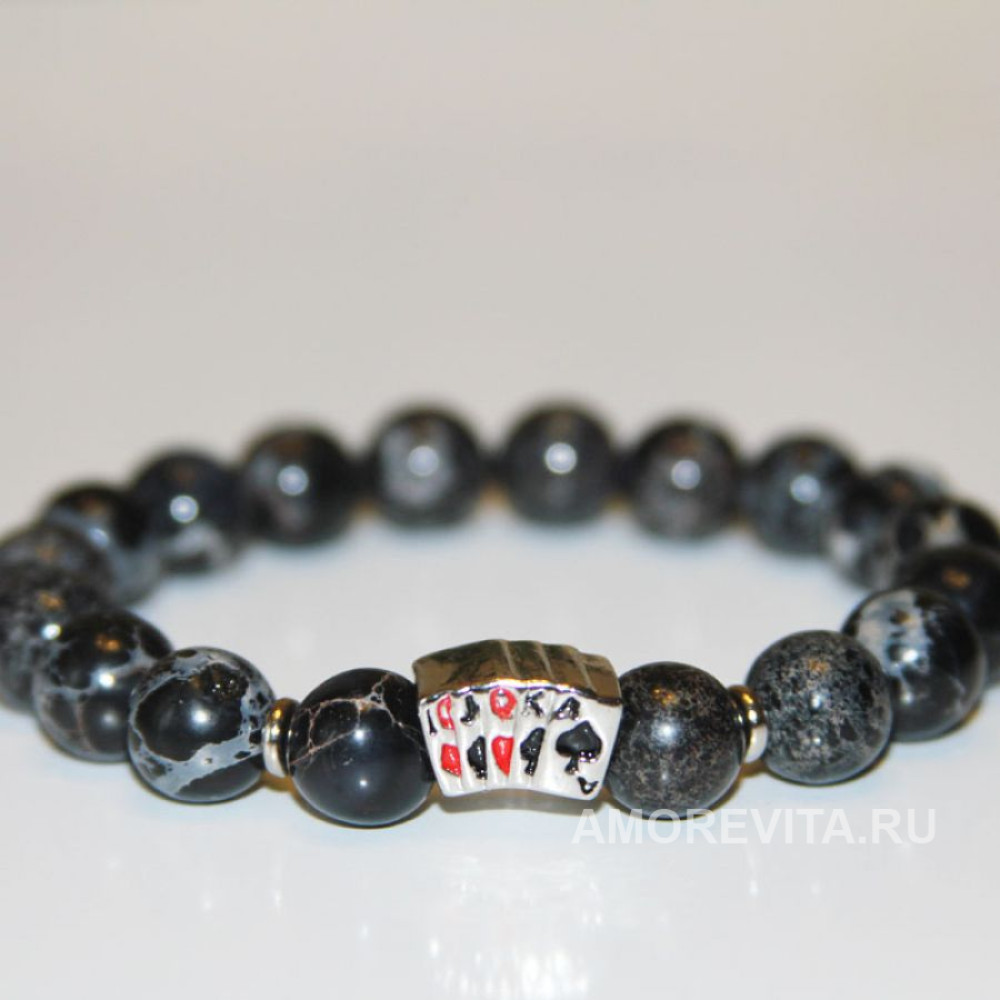 Браслет черно-серого цвета с бусиной "стрит" (одна из покерных комбинаций) из натурального Варисцита