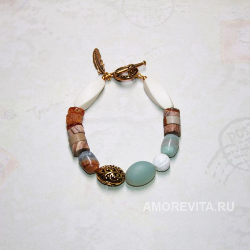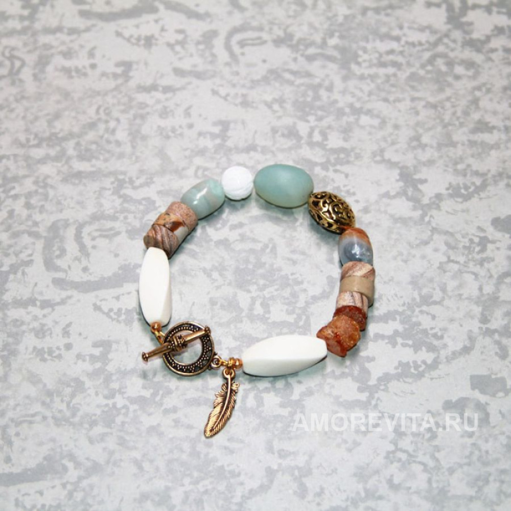Стильный браслет в спокойных мятно-бежевых оттенках с подвеской перышком.