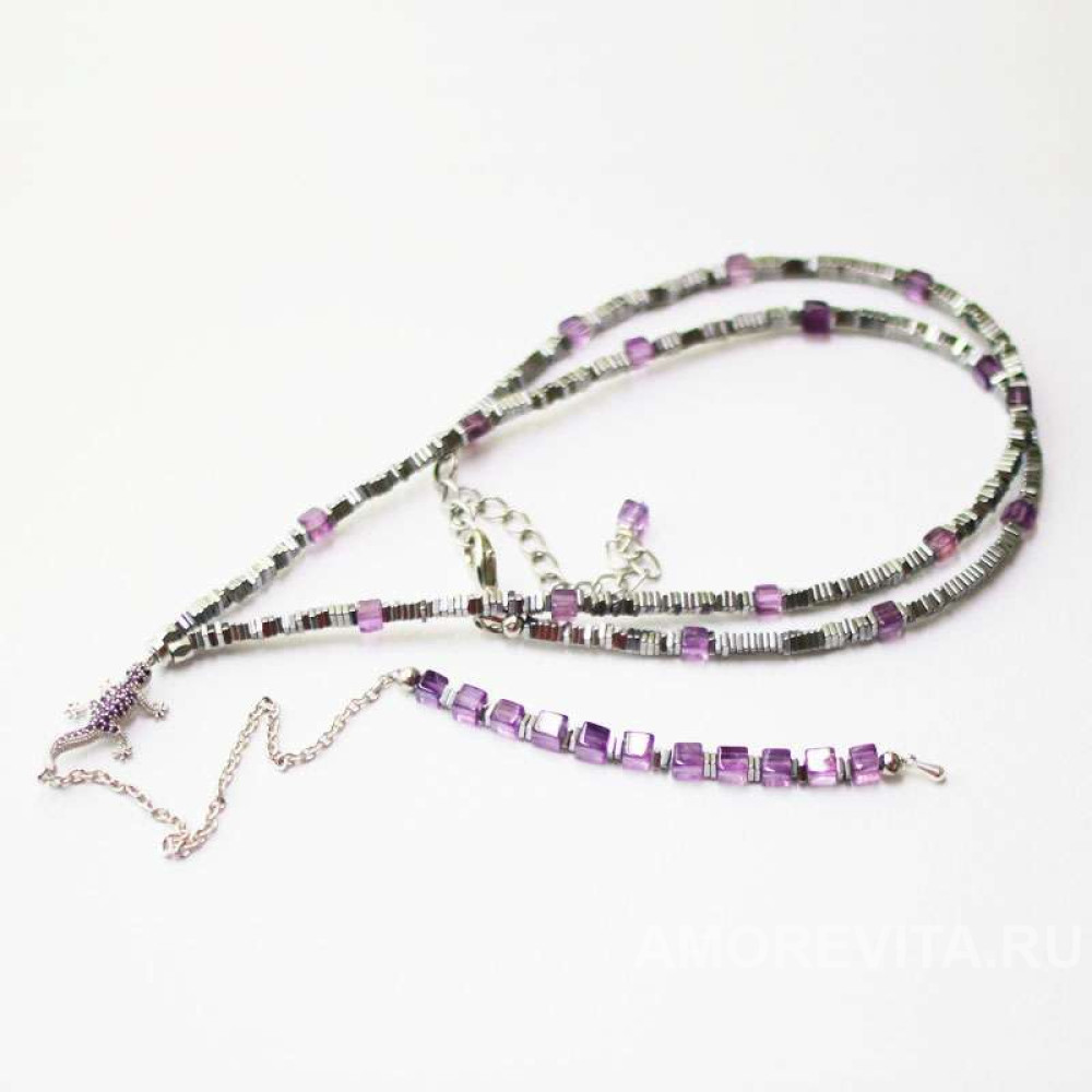 Длинное колье с ящерицей, усыпанной цирконами аметистового цвета, качественного европейского производства. Колье из натурального Аметиста в форме кубиков и Гематита темного серебристого цвета. В колье использована качественная фурнитура американского производства, посеребренная, гипоаллергенная.