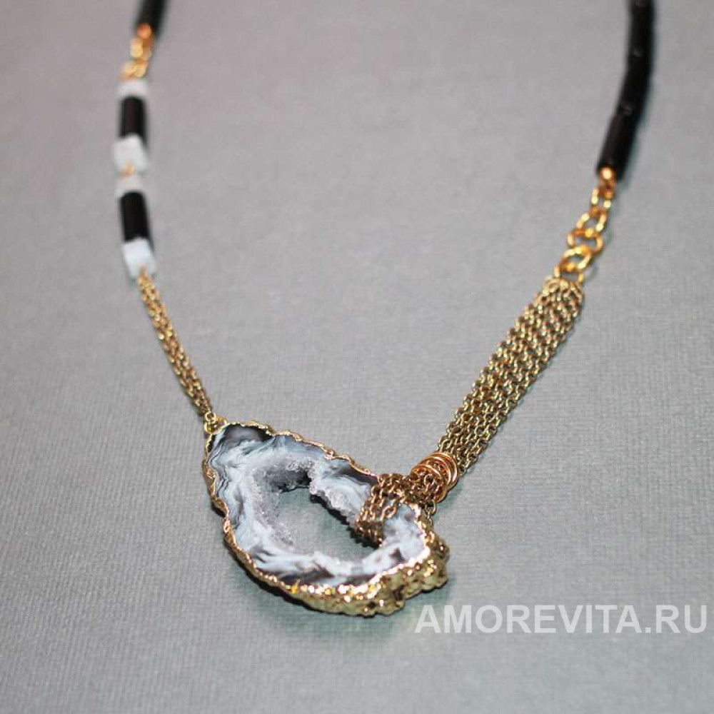 Стильное колье из трубочек черного Агата и кубиков Лунного камня, с шикарной подвеской из натурального среза Агата (производство Бразилия) с друзой (сверкающие кристаллы внутри камня). Кулон-подвеска в позолоченной оправе. В колье использована качественная фурнитура американского и израильского производства, позолоченная.