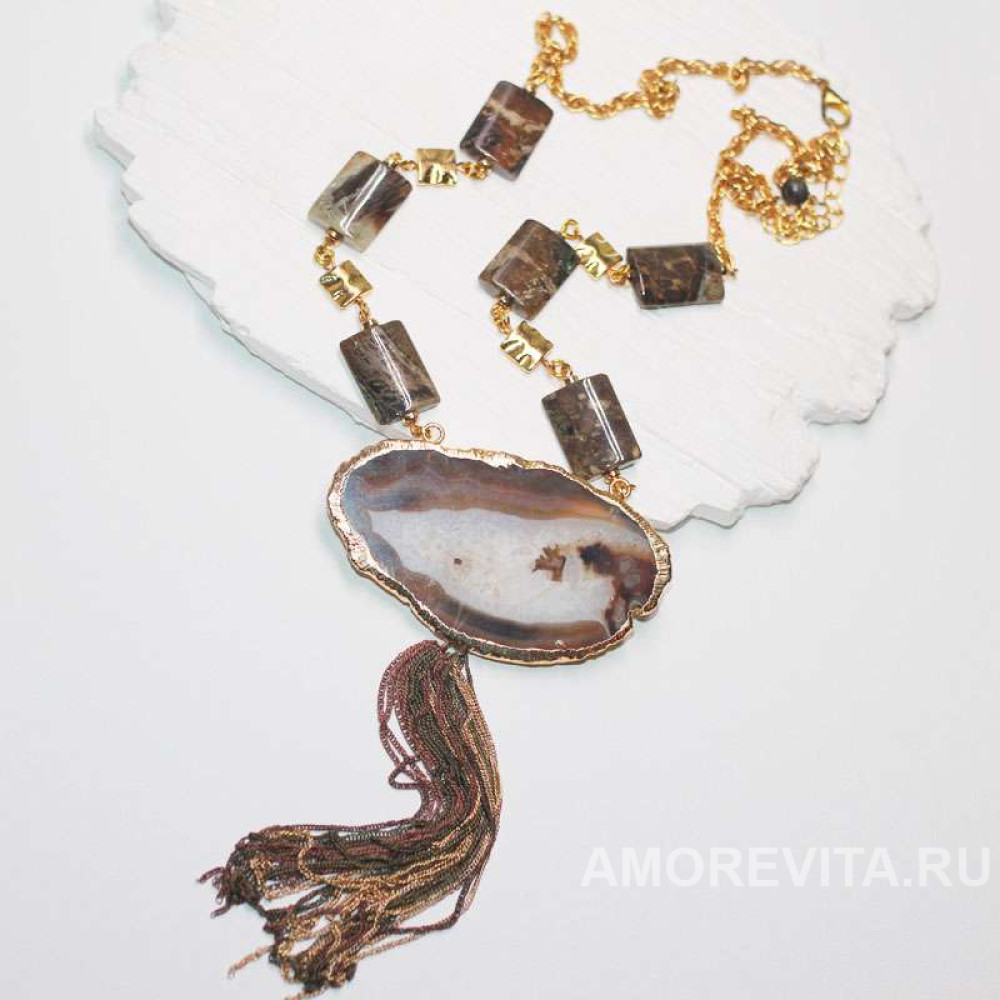 Крупный элемент коннектор - натуральный срез Агата с очень красивым неповторимым природным рисунком коричнево-бежевого цвета, дополнено прямоугольными бусинами натуральной Яшмы, завершает украшение кисточка из цепочек.