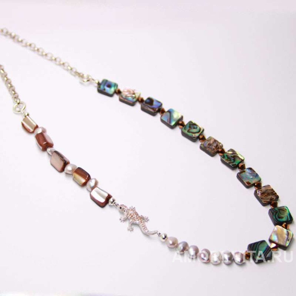 Главным и индивидуальным элементом колье является посеребренная ящерица, усыпанная цирконами цвета шампань. Ящерица и вся остальная фурнитура качественного американского производства, посеребренная. В колье присутствуют вставки бусин чешского стекла.