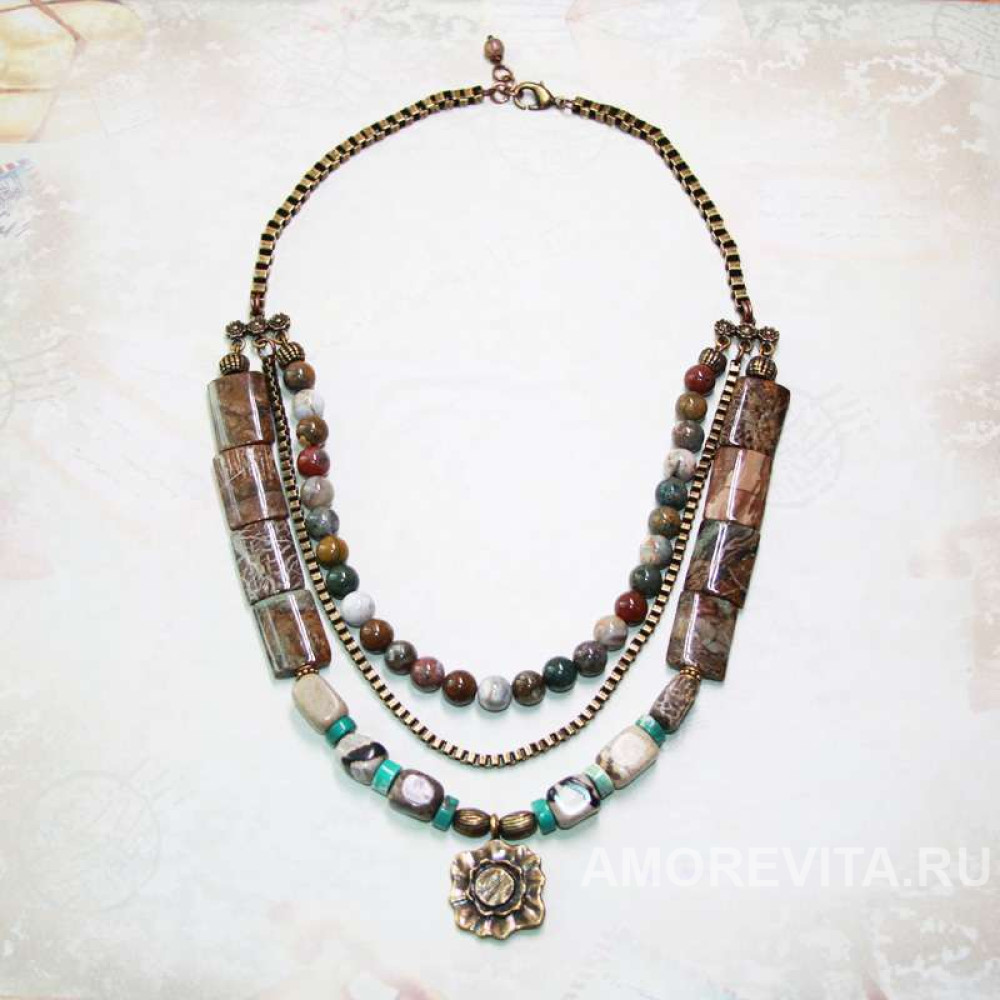 Трехрядное колье натуральных пастельных оттенков - от светло-кремового до темно-зеленого и коричневого. Камни - Яшма различных форм и размеров и Бирюза иранская. В колье использована качественная фурнитура американского и израильского производства, цвет бронза, гипоаллергенная.
