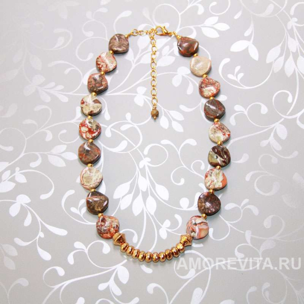 Универсальное колье приятного бежевого цвета из крученых круглых плоских бусин Яшмы океанической.