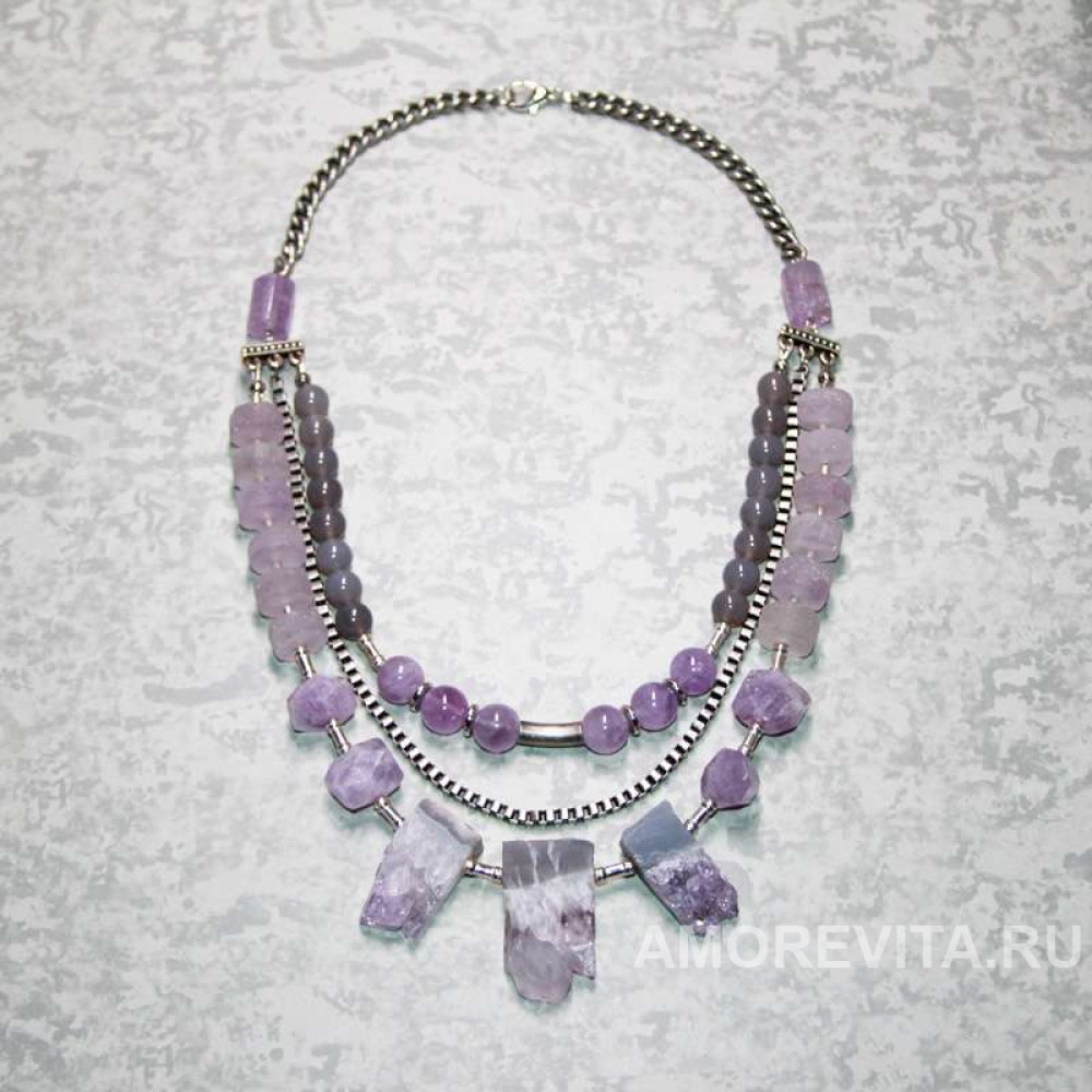 Многорядное колье из Аметиста различных форм и размеров, три центральных камня срезы-сталактиты с друзой (сверкающие кристаллы камня) и бусины Агата серого цвета.