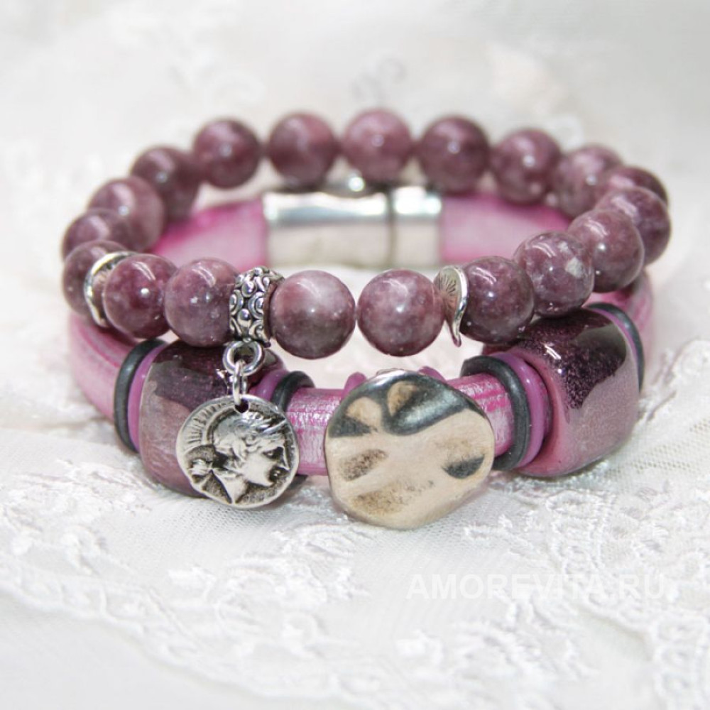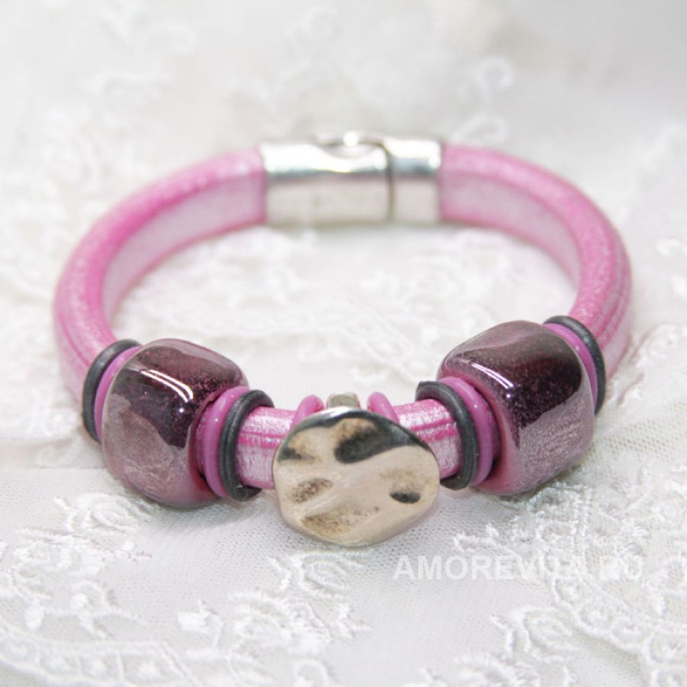 Нижний браслет - основа браслета - натуральная кожа розового перламутрового цвета, фурнитура - керамика и металл, замок магнитный. Браслет изготовлен из качественных материалов европейского производства.