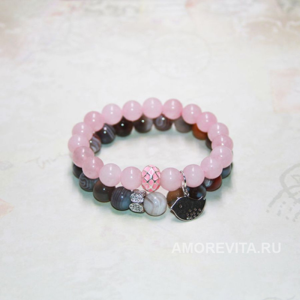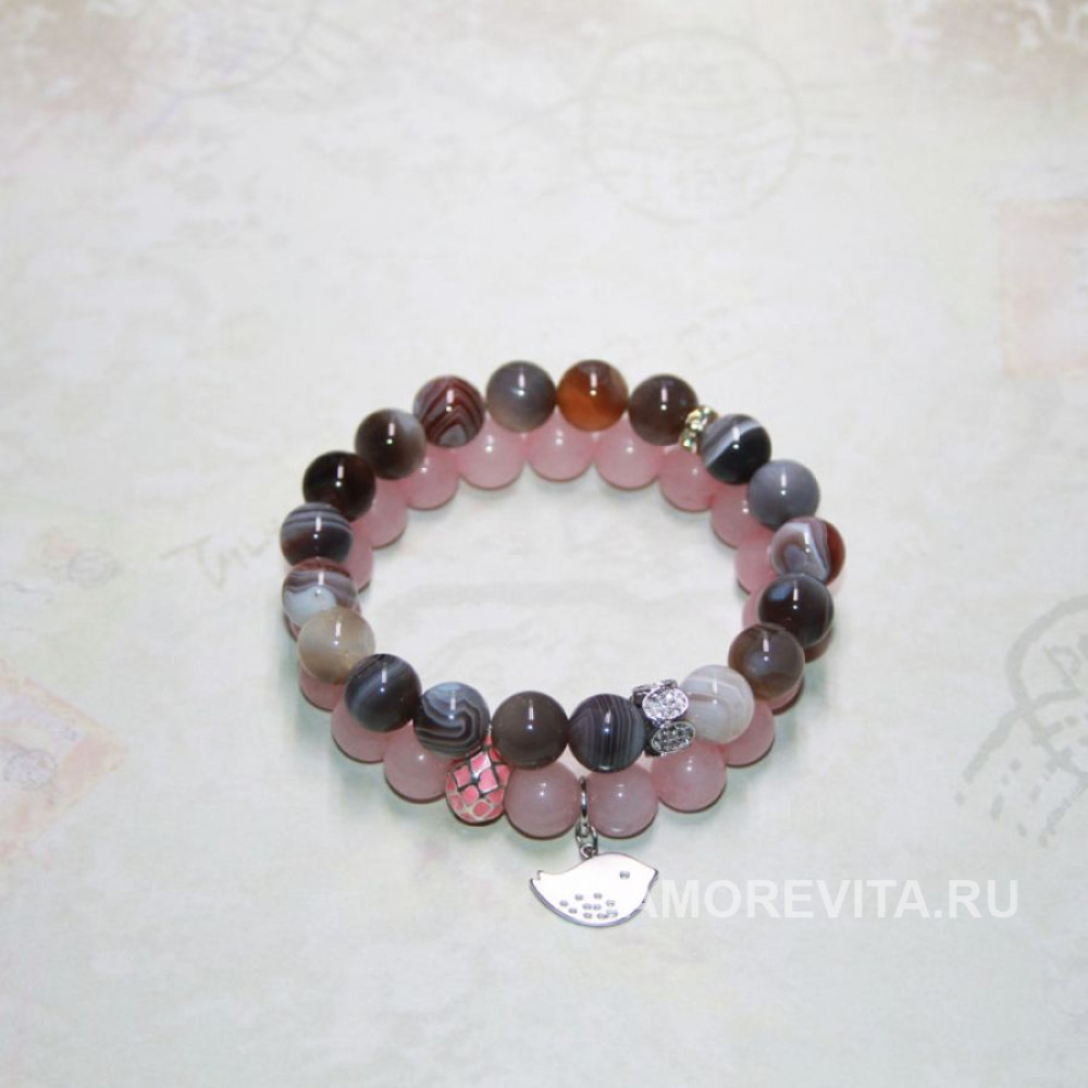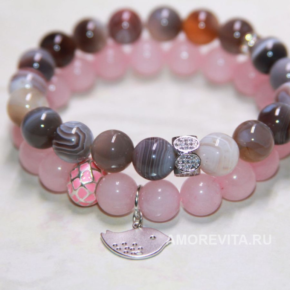 Комплект браслетов красивого цветового сочетания - серого и розового, очень красивый камень Агат ботсвана и нежный розовый Кварц.