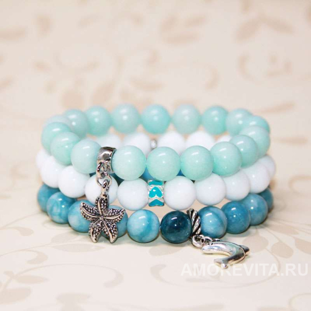 Комплект из 3-х браслетов голубого и белого цветов с подвесками в морском стиле - дельфин и морская звездочка.