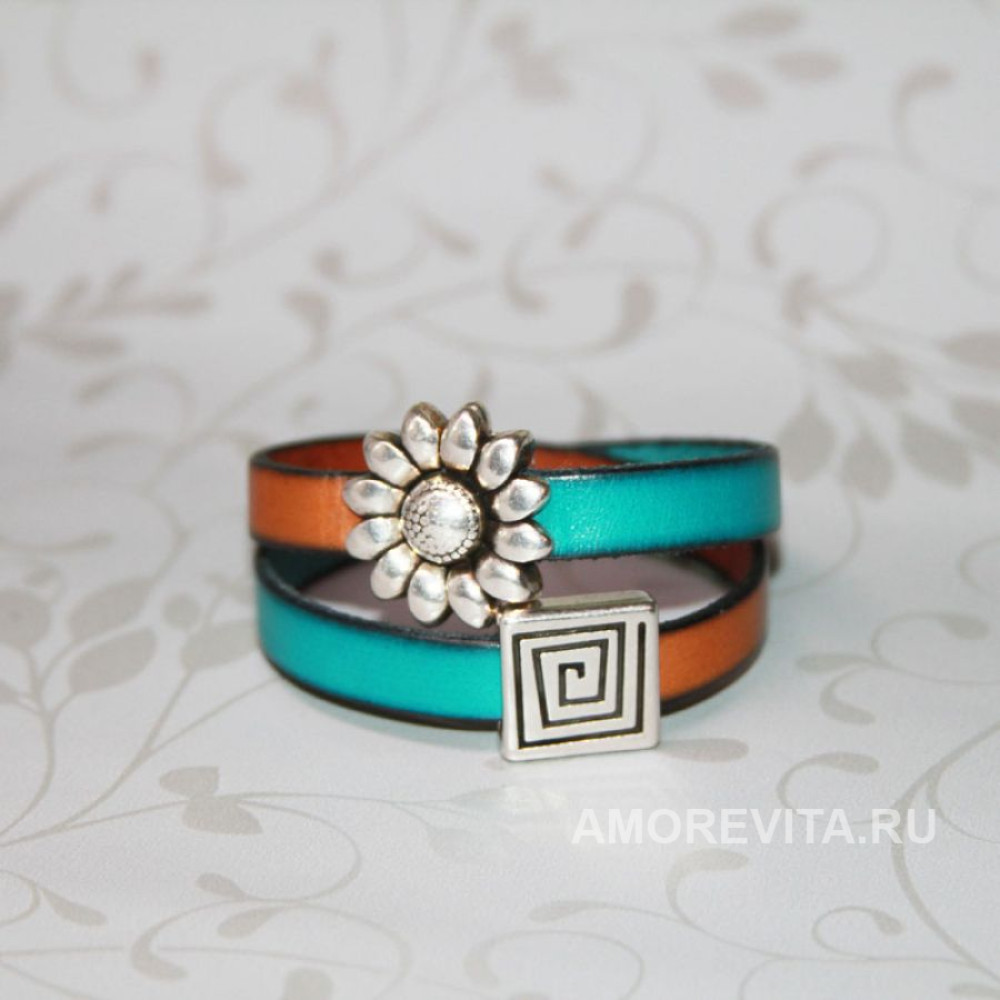 Основа браслета - натуральная кожа коричневого и бирюзового цветов, фурнитура и замок металлические, очень интересный и красивый магнитный замок в виде цветка.
