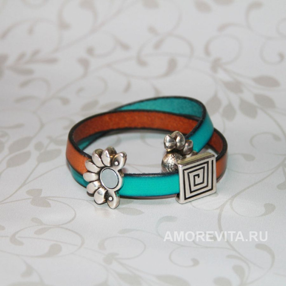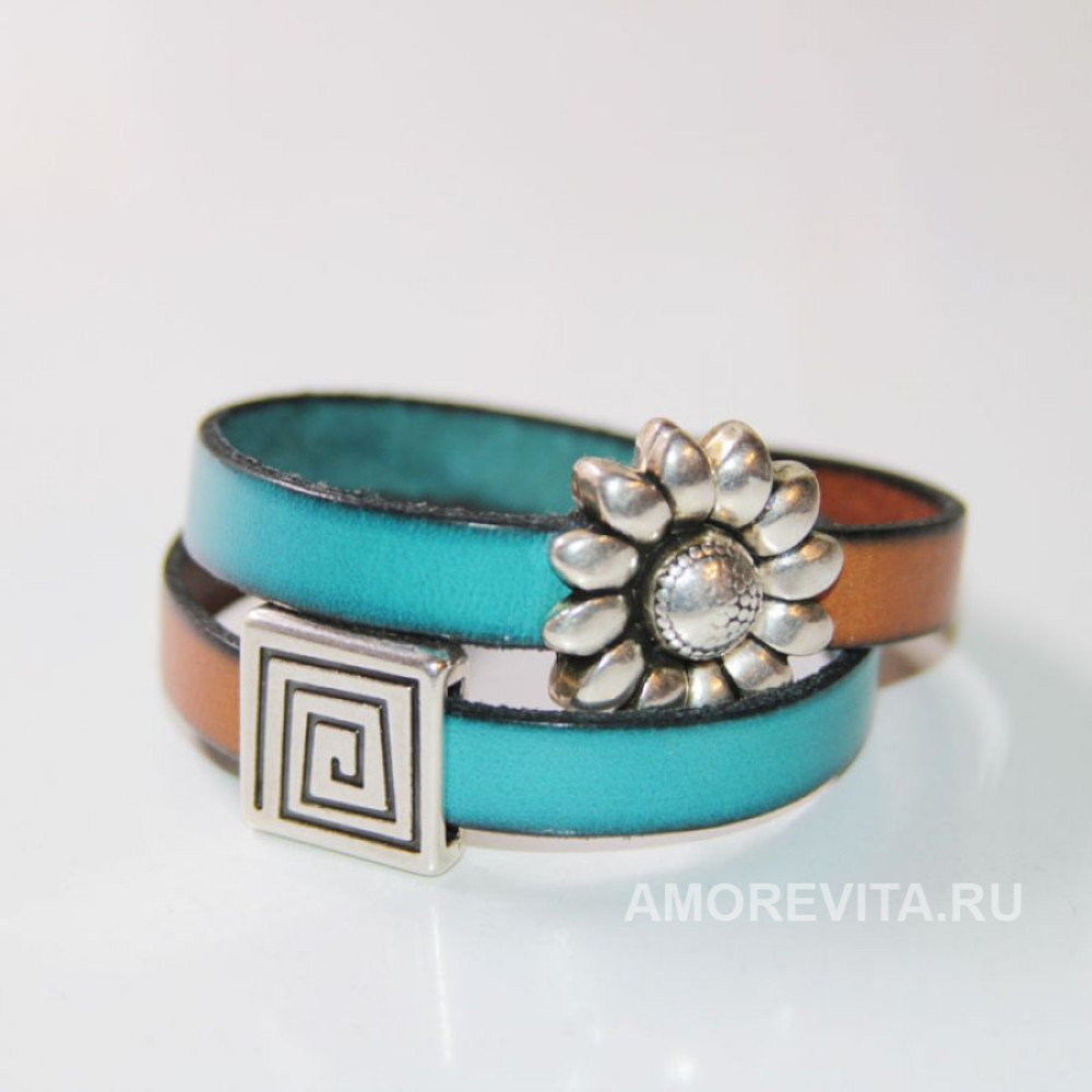 Стильный и необычный кожаный браслет в два оборота из натуральной кожи двух цветов - коричневый и бирюзовый.