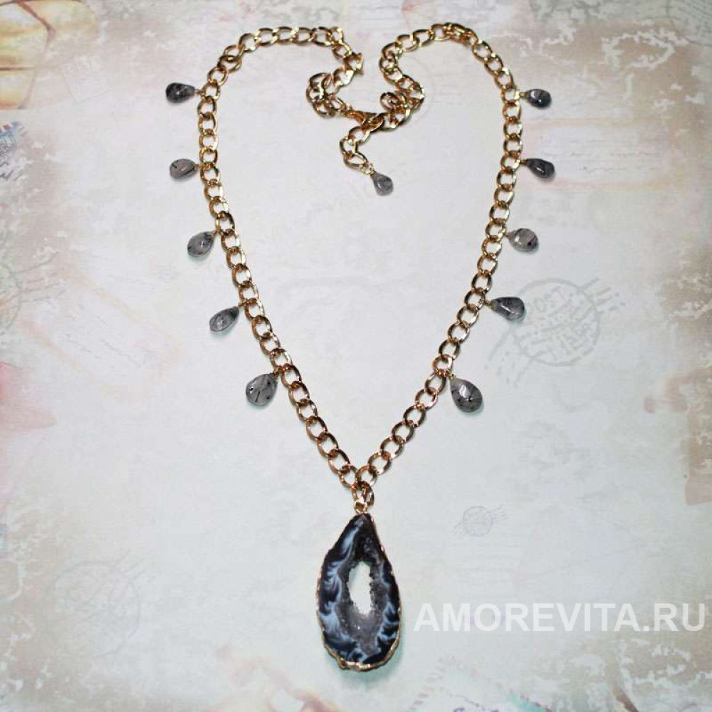 Кулон из шикарного натурального среза Агата (производство Бразилия) с друзой (сверкающие кристаллы внутри камня). Кулон-подвеска в позолоченной оправе и на позолоченной крупной цепочке качественного европейского производства. Цепочку украшают капли натурального рутилового Кварца.