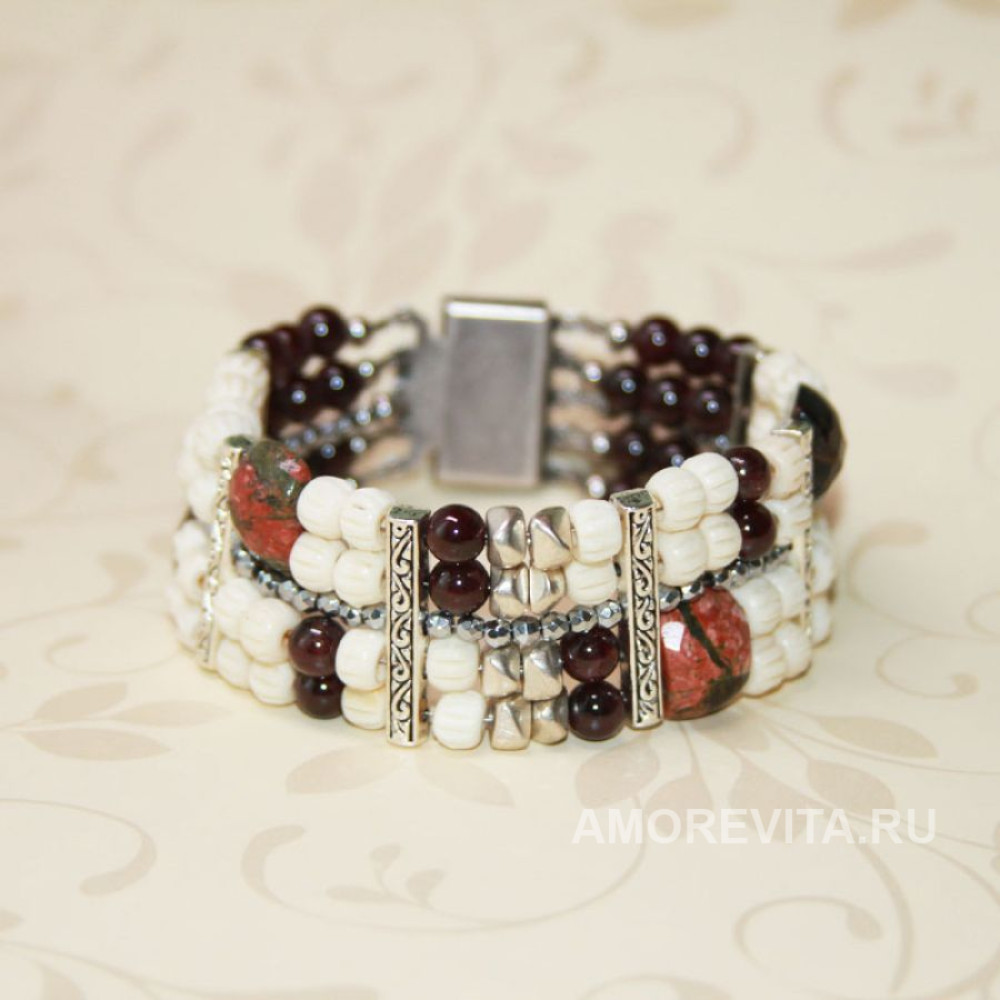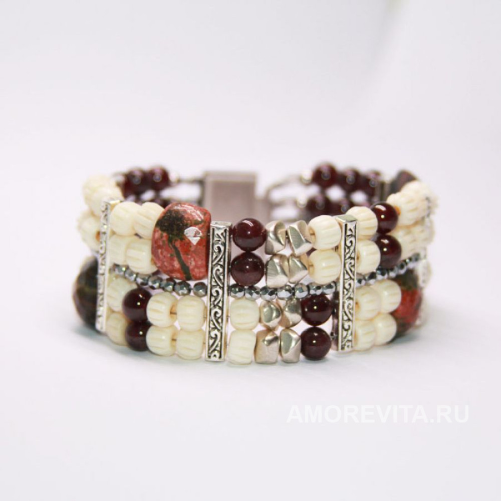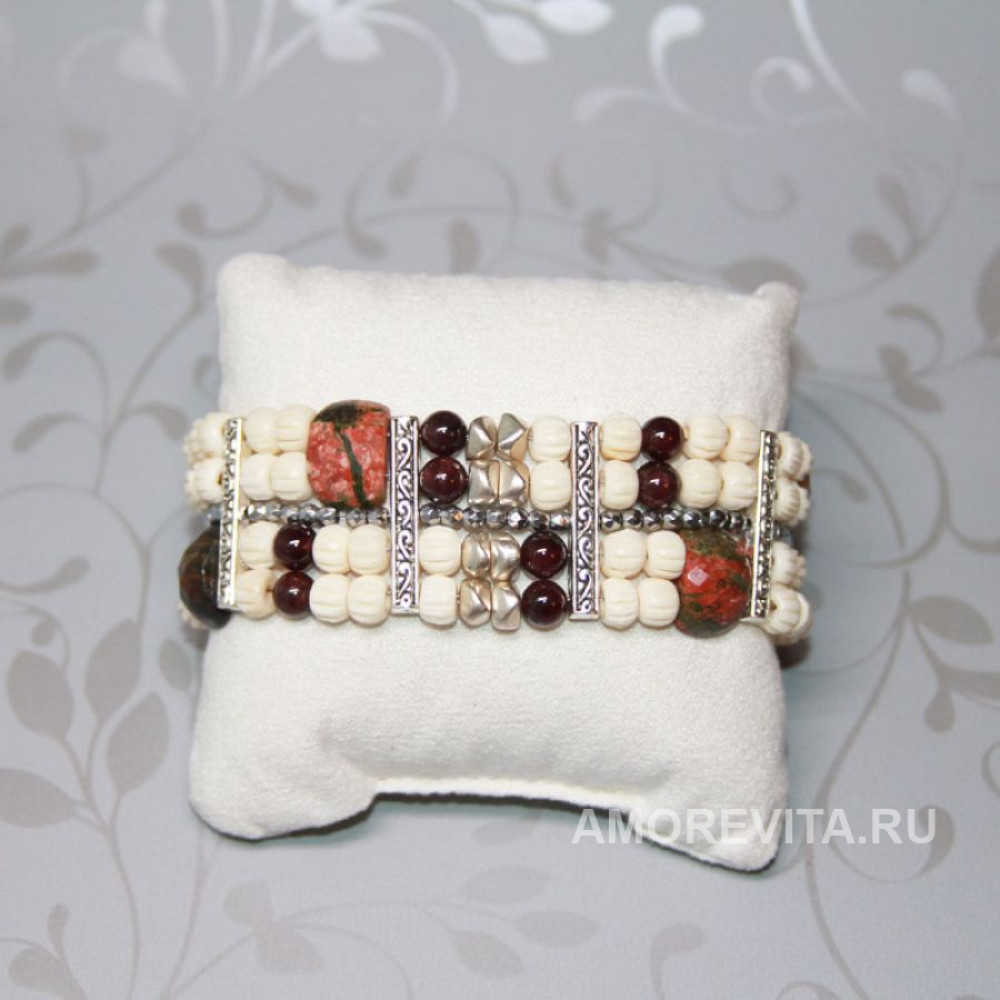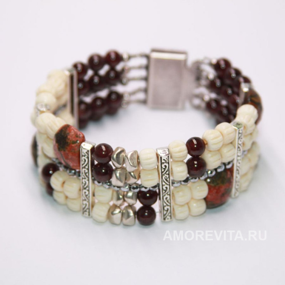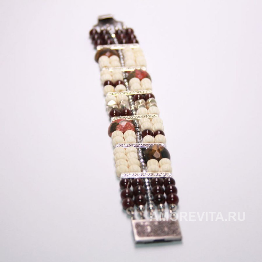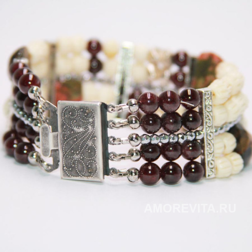 Камни - Гранат (6мм), Яшма, Гематит ювелирной огранки серебристого цвета (2мм), белая резная кость быка.