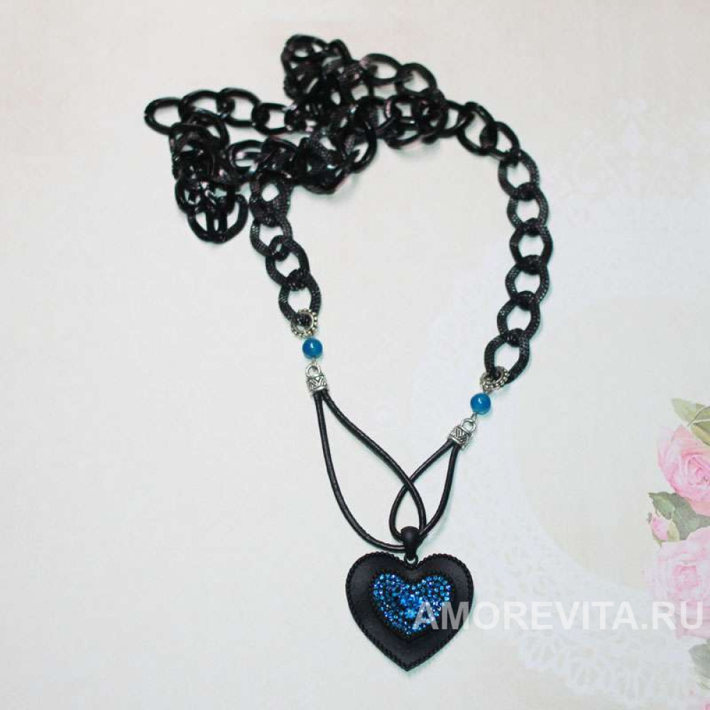 Кулон черного цвета в виде двойного сердца с синими кристаллами, бусинками натурального Агата синего цвета, на черных гладких шнурах из натуральной кожи и на крупной цепи черного цвета. Цепь с лицевой стороны с рифлением, с оборотной стороны - гладкая.
