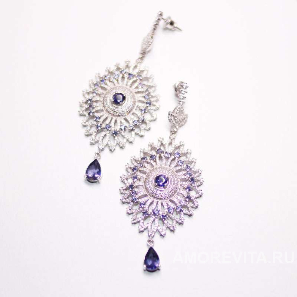 Бесподобные серьги с натуральным фиалковым Иолитом, все усыпаны прозрачными фианитами (1 мм - 1.5 мм). Серьги полностью из серебра 925 пробы, покрыты 14К белым золотом. По оценке чистоты качества камня в своей группе камней (GIA Clarity Type II) - имеет высшее качество камня VVS. Происхождение камней - Африка (твердость 7.0 - 7.5), размер камней: в центре - 4 мм, по кругу - 2 мм, капля - 7 мм * 9 мм.