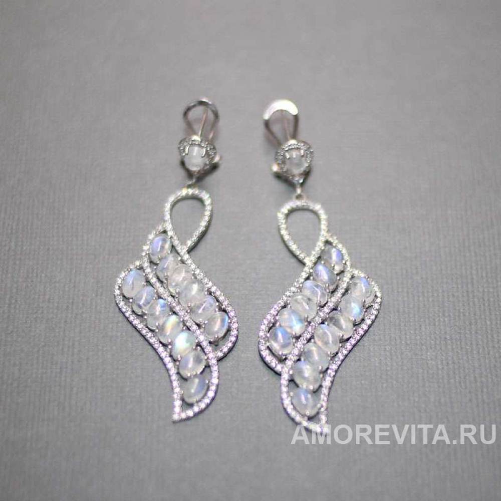Шикарные серьги с натуральным Лунным камнем, инкрустированы прозрачными фианитами (1,2 мм). Серьги полностью из серебра 925 пробы, покрыты 14К белым золотом. Происхождение камней - Шри-Ланка (твердость 5.5 - 6.5), размер камней - 6 мм * 4 мм.