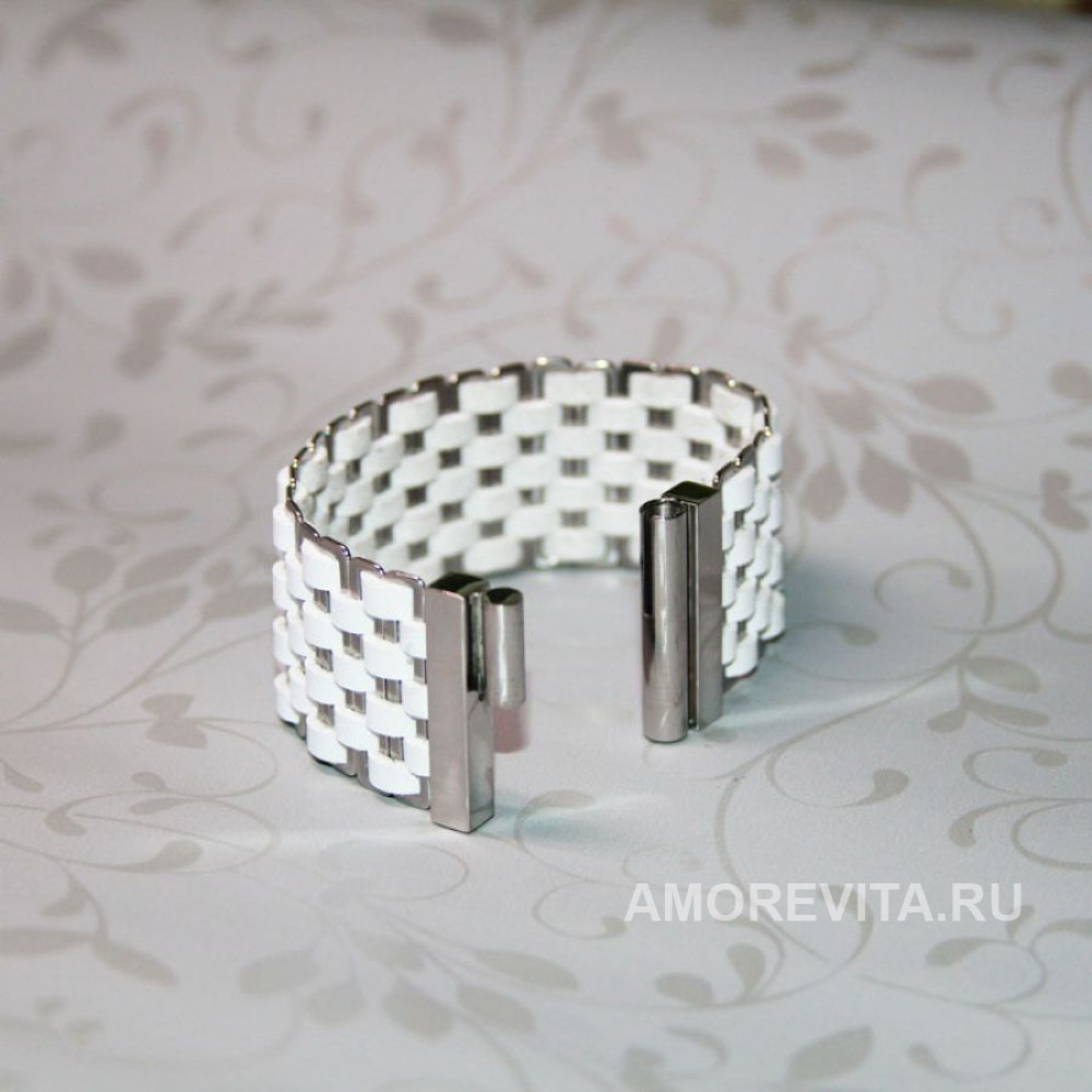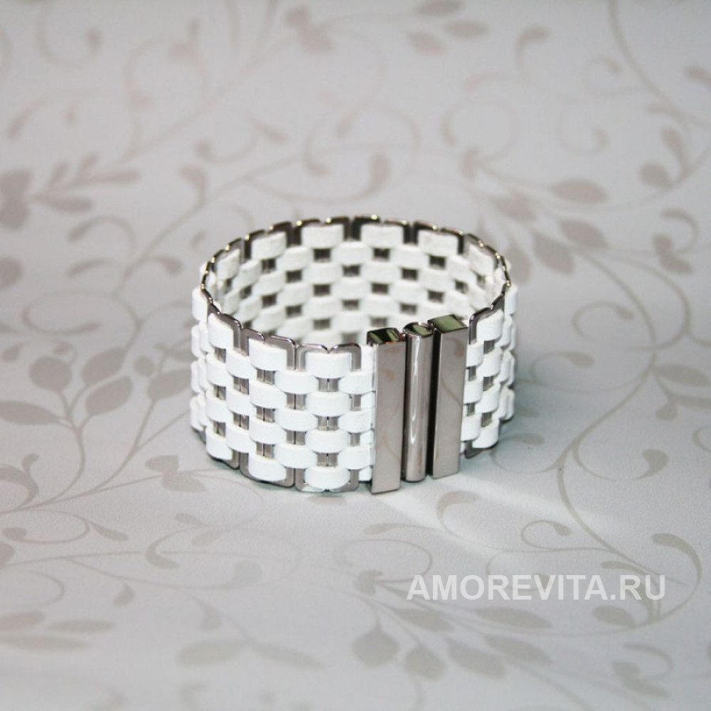Основа браслета - натуральная кожа белого цвета, фурнитура и замок металлические. Замок магнитный с вертикальным способом открывания/закрывания, что очень удобно и легко делать даже самостоятельно, но при этом такой замок исключает возможность внезапного расстегивания. Браслет изготовлен из качественных материалов европейского производства, гипоаллергенно.
