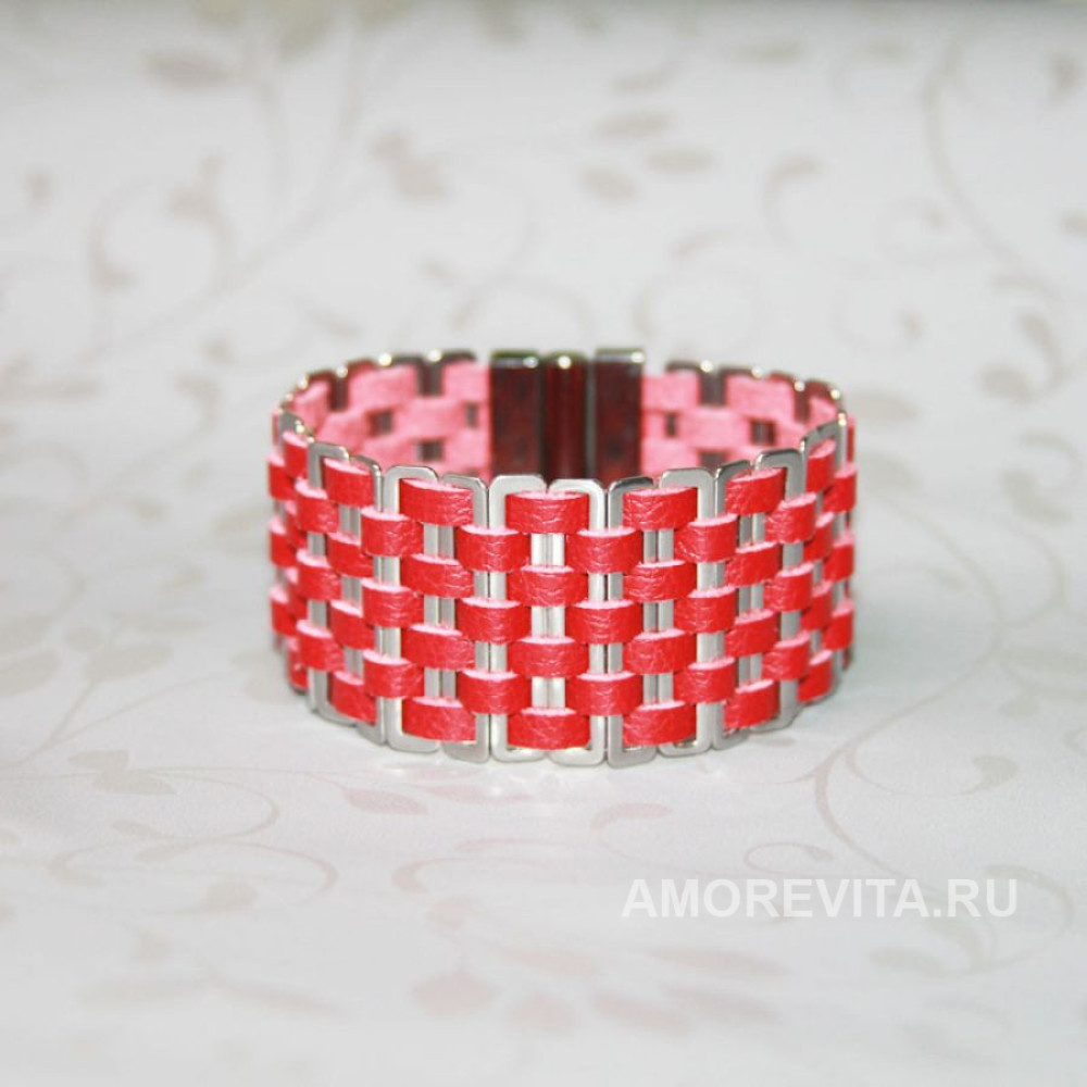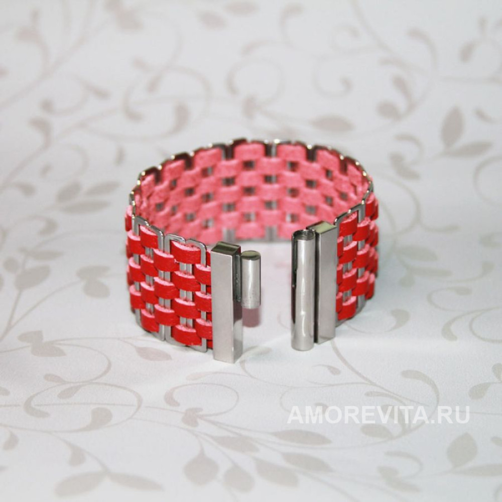 Основа браслета - натуральная кожа красного цвета, фурнитура и замок металлические. Замок магнитный с вертикальным способом открывания/закрывания, что очень удобно и легко делать даже самостоятельно, но при этом такой замок исключает возможность внезапного расстегивания. Браслет изготовлен из качественных материалов европейского производства, гипоаллергенно.