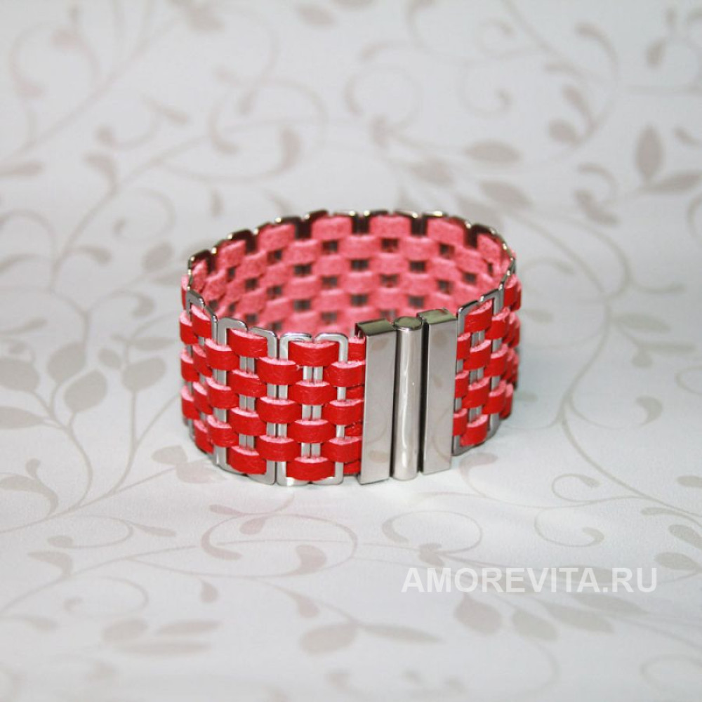 Широкий браслет из натуральной красной кожи с металлическими деталями серебряного цвета.